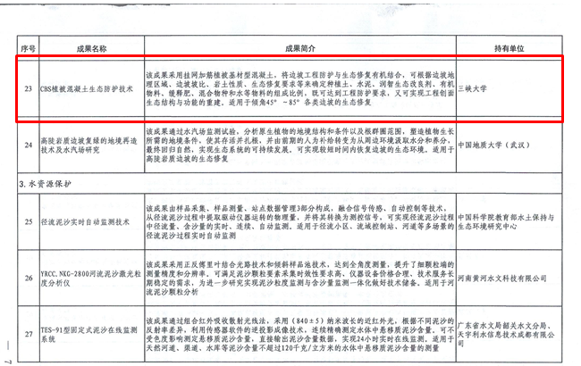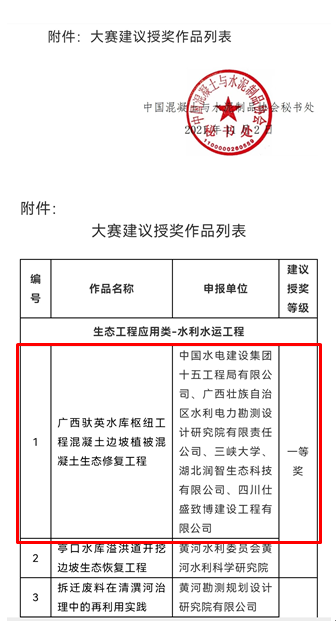 為深入貫徹落實習近平總書記關于保障國家水安全重要講話精神,積極推動新階段水利高質(zhì)量發(fā)展,切實做好成熟適用水利科技成果推廣運用,切實提高行業(yè)科技水平,水利部組織開展了2021年度成熟適用水利科技成果的征集、評審與公示工作。我公司研發(fā)的核心技術(shù)“CBS植被混凝土生態(tài)防護技術(shù)”獲得入選,其應用項目“廣西馱英水庫樞紐工程混凝土邊坡植被混凝土生態(tài)修復工程”在2021年度“建華建材杯”第二屆全國生態(tài)混凝土創(chuàng)新設計應用大賽榮獲一等獎。