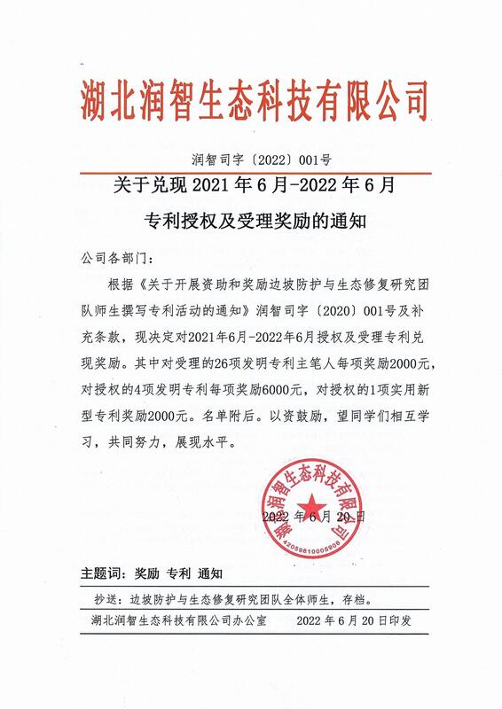湖北潤智生態(tài)科技有限公司關(guān)于兌現(xiàn)2021年6月—2022年6月專利授權(quán)及受理獎勵的通知(潤智司字〔2022〕001號)